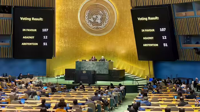 न्यूयॉर्क: भारत ने मंगलवार को संयुक्त राष्ट्र महासभा में एक रूस-यूक्रेन युद्ध पर अहम प्रस्ताव पर वोटिंग में हिस्सा नहीं लिया। प्रस्ताव में यूक्रेन में पूरी तरह और बिना शर्त युद्धविराम की मांग की गई है, जिसे संयुक्त राष्ट्र महासभा ने 24 फरवरी को रूस-यूक्रेन युद्ध के चार साल पूरे होने पर पास किया है। प्रस्ताव में यूक्रेन के अंतरराष्ट्रीय बॉर्डर का समर्थन किया गया। 193 सदस्यों वाली संयुक्त राष्ट्र महासभा ने मंगलवार को आए इस प्रस्ताव को भारी अंतर से अपनाया है। कीव की तरफ से पेश किए गए इस प्रस्ताव के पक्ष में 107 देशों ने वोट किया। 12 इसके खिलाफ रहे, जबकि 51 देशों ने वोट नहीं दिया।